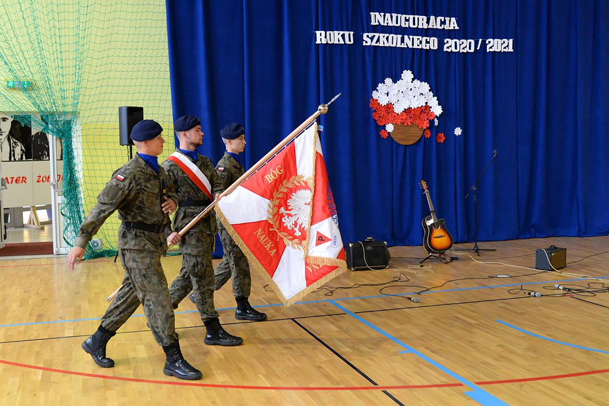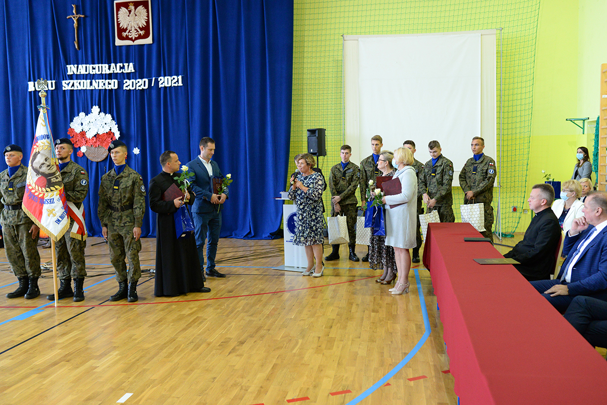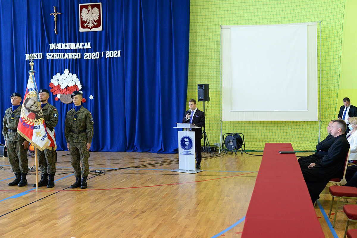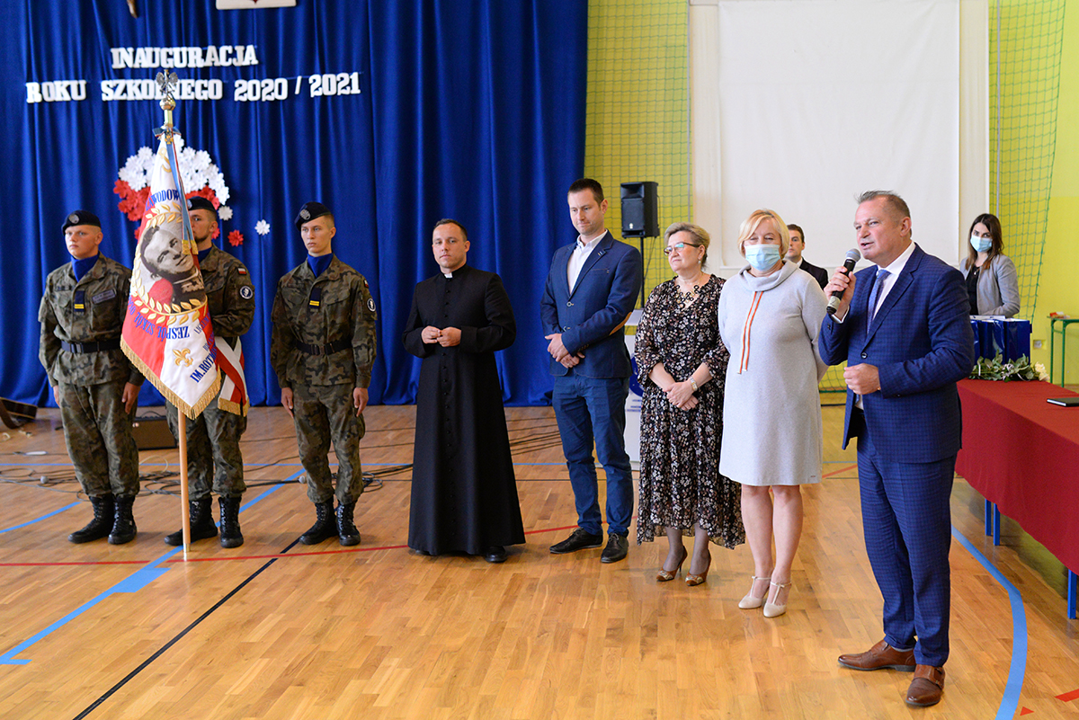 Spotkanie tradycyjnie rozpoczęło się przemarszem pocztu sztandarowego, młodzieży, nauczycieli i wychowawców naszej szkoły do kościoła pod wezwaniem Trójcy Przenajświętszej. Po nabożeństwie wszyscy zebrani udali się do budynku liceum. W hali sportowej odbył się apel, który rozpoczął Dyrektor ZSOiZ w Ciechanowcu Pan Łukasz Godlewski. Powitał on bardzo gorąco gości przybyłych na inaugurację roku szkolnego: Burmistrza Ciechanowca Pana Eugeniusza Święckiego, Sekretarz Gminy Ciechanowiec Panią Annę Czapkowską, Przewodniczącego Rady Gminy Miejskiej Pana Marka Karolewskiego, Przewodniczącą Rady Rodziców naszej szkoły Panią Agatę Koc, księży, nauczycieli, wychowawców i pracowników obsługi szkoły, a także młodzież szkolną wraz z rodzicami. Pan Dyrektor podkreślił, iż dołoży wszelkich starań, aby wszyscy uczniowie czuli się w naszej szkole dobrze i bezpiecznie. Zapewnił, że pracownicy naszej placówki zadbają, aby młodzież miała odpowiednie warunki do nauki, rozwoju i zdobycia wykształcenia. Podkreślił też, że w szczególnie trudnym czasie pandemii wszyscy członkowie społeczności szkolnej są odpowiedzialni za bezpieczeństwo i zdrowie nie tylko własne, ale również innych, dlatego tak ważne jest przestrzeganie zasad regulaminu pracy szkoły na czas pandemii wirusa COVID-19.