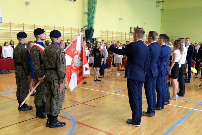 Kolejnym, bardzo istotnym punktem uroczystości było ślubowanie klas pierwszych. Przedstawiciele każdej klasy przysięgając na sztandar w imieniu własnym i kolegów powtarzali tekst ślubowania, zobowiązując się jednocześnie do wytrwałej pracy oraz zachowania godnego ucznia ZSOiZ w Ciechanowcu i obywatela Polski.