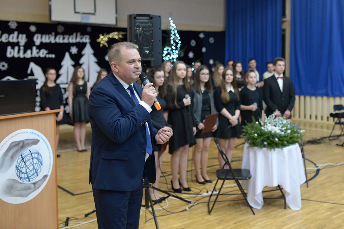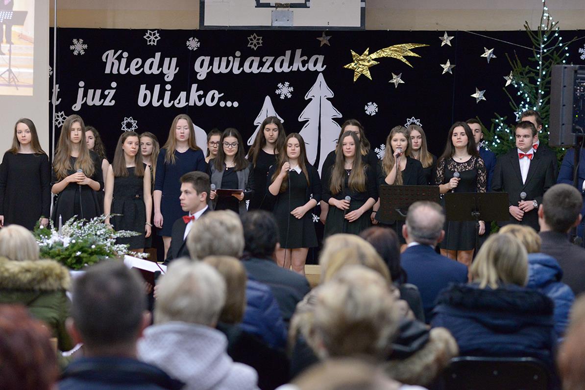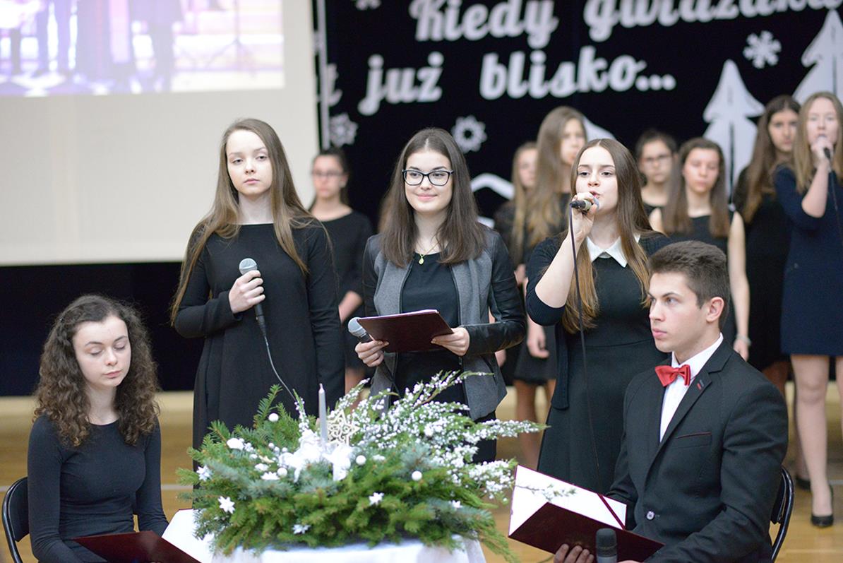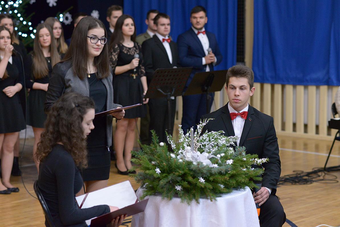 Na początku zaprosił on do obejrzenia specjalnego występu naszego szkolnego chóru, zaprezentowanego również 15 grudnia na przedświątecznym spotkaniu Jego Ekscelencji biskupa Tadeusza Pikusa z dyrektorami szkół i placówek oświatowych z terenu województwa podlaskiego. Wykonane kolędy, pastorałki i utwory muzyczne, a także przytoczone przez młodzież wiersze, skłaniały do refleksji nad istotą Świąt Bożego Narodzenia. Występ naszych młodych artystów bardzo podobał się zebranym.