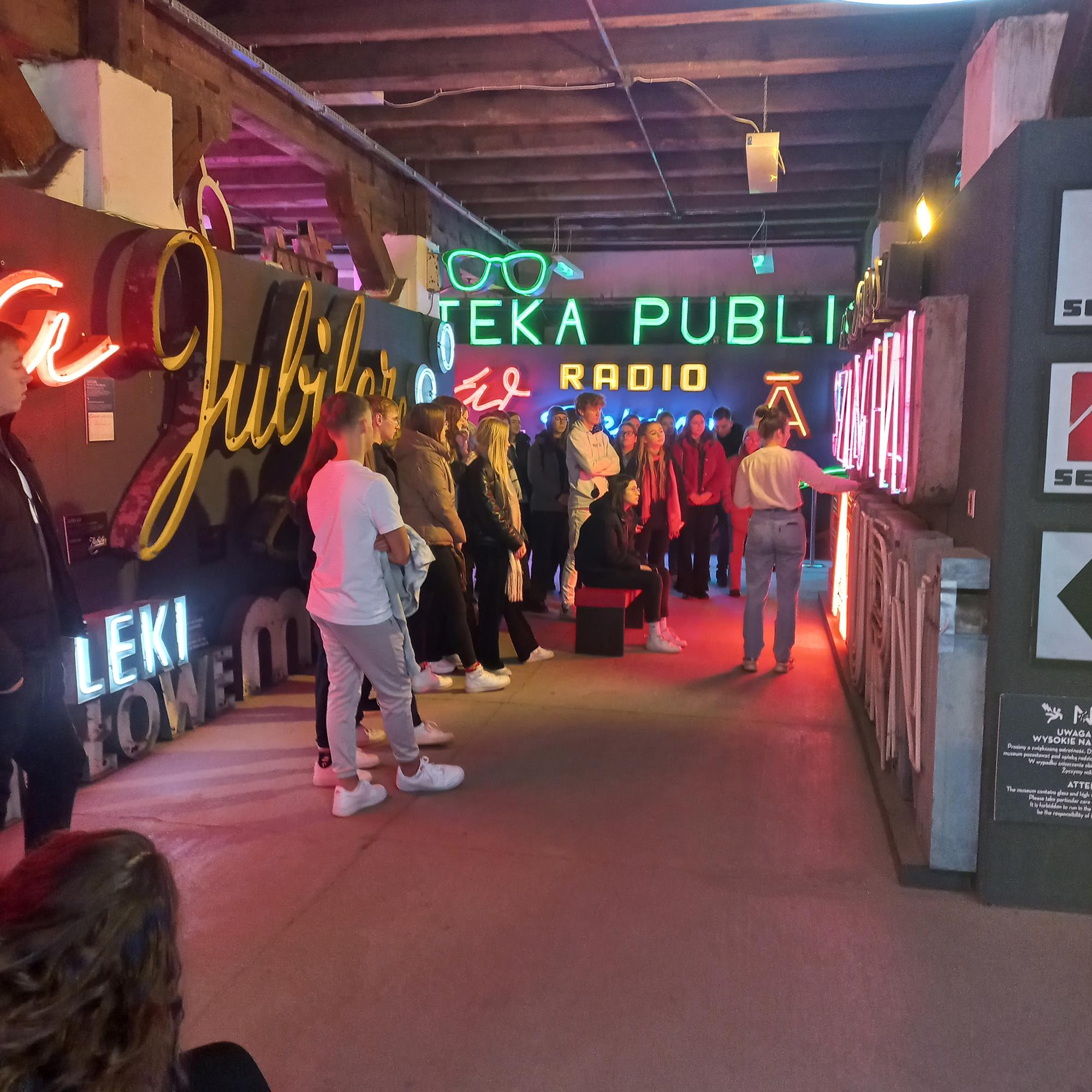 Pierwszym punktem wyjazdu było Muzeum Neonów, gdzie uczestnicy wyjazdu mogli podziwiać wystawę ok. stu starych neonów i innych instalacji reklamowych projektowanych przez wybitnych artystów. Pani przewodnik opowiedziała grupie historię neonów oraz o procesie ich tworzenia.