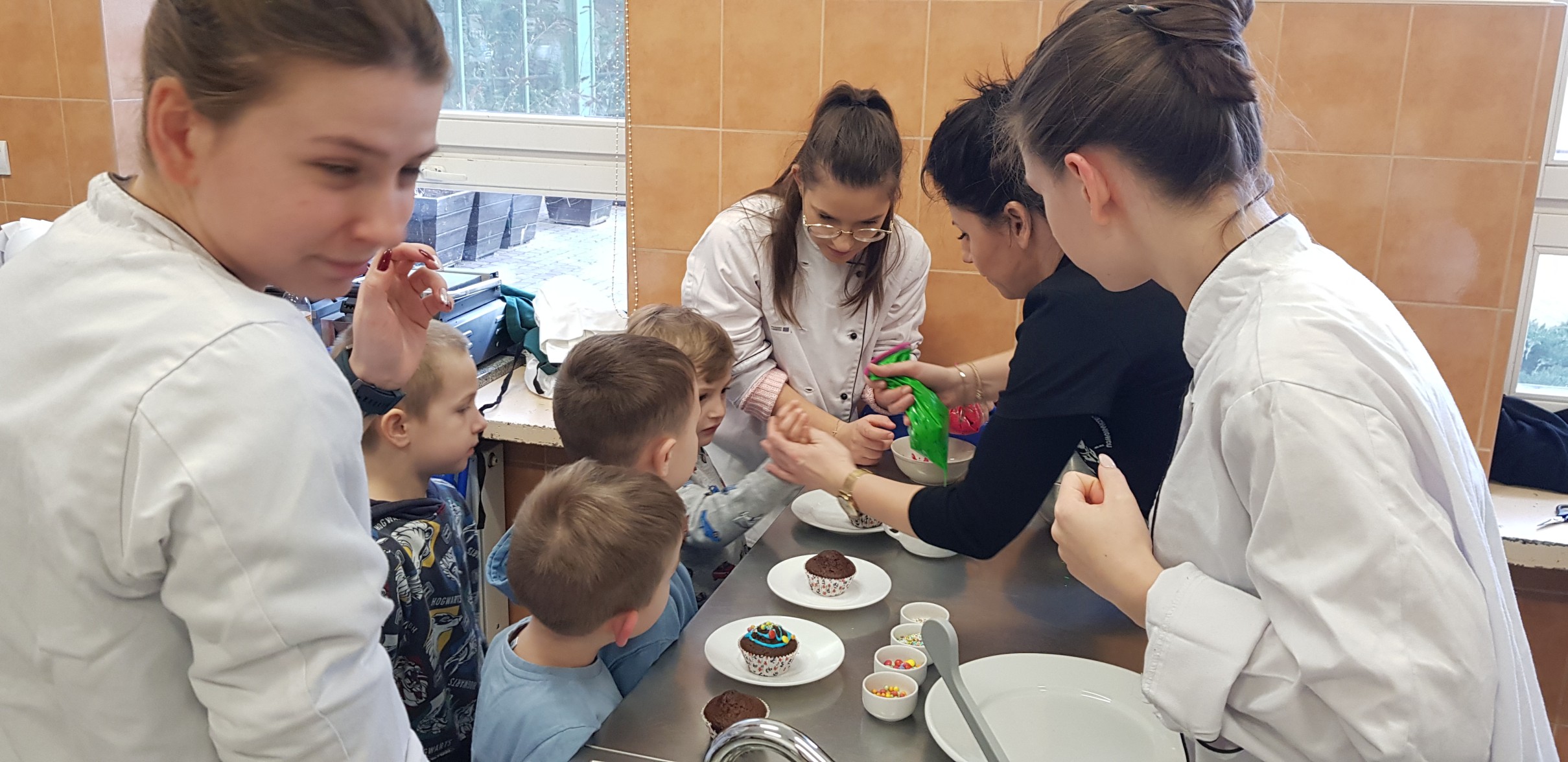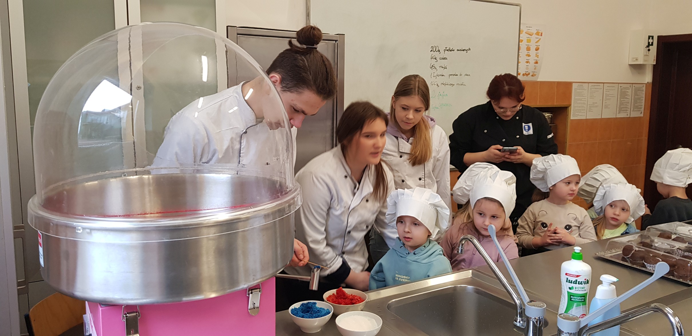 W dniu 1 marca w szkole było naprawdę słodko. Naszą pracownię gastronomiczną odwiedziła grupa 4-5 latków, przedszkolaków z Przedszkola w Ciechanowcu. Tematem warsztatów zorganizowanych przez Panią Ewelinę Kozłowską było praca cukiernika czyli zdobienie babeczek oraz wypiekanie ciastek. Dzieci zostały zapoznane z warunkami pracy kucharza oraz cukiernika. Miały możliwość samodzielnego ozdobienia muffinek za pomocą lukru oraz wielokolorowych posypek jak też przygotowały masę i formowały ciasteczka owsiane. We wszystkich zadaniach przedszkolakom towarzyszyli uczniowie klasy 1c i 4c technikum. Zwieńczeniem pracy cukierniczej było wykonanie waty cukrowej w kolorach zaproponowanych przez przedszkolaków oraz malowanie twarzy w wykonaniu Zuzi Zabłockiej. Spotkanie zostało zainicjowane przez Panię Emilię Krysińską. Dziękujemy Panu Dyrektorowi, Łukaszowi Godlewskiemu za wyrażenie zgody zorganizowanie tego typu warsztatów oraz Pani Ewelinie Kozłowskiej i uczniom technikum za ich przygotowanie i przeprowadzenie.