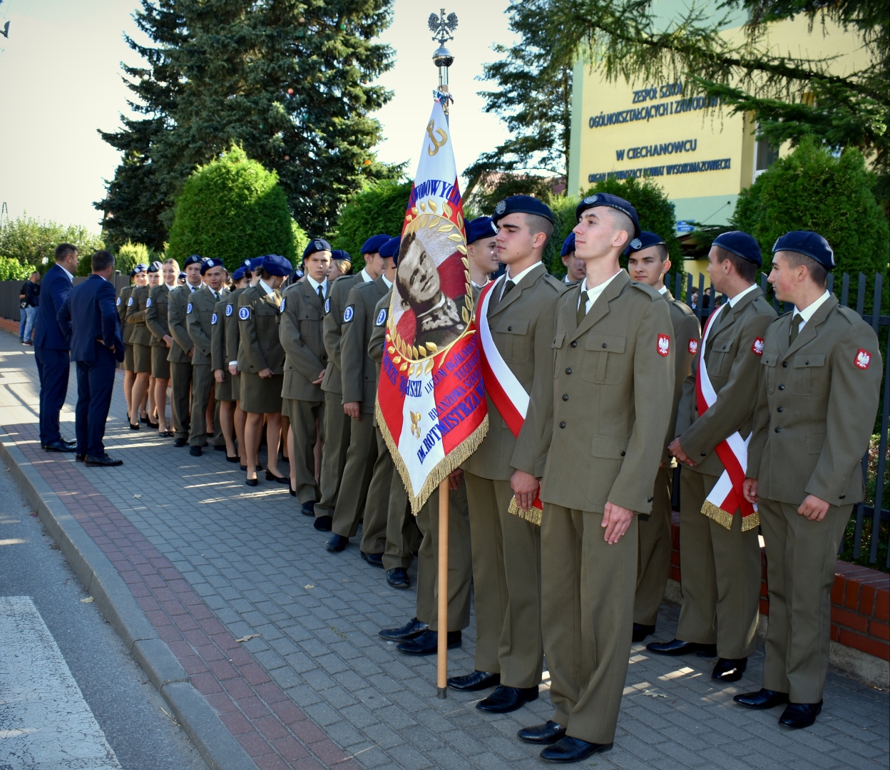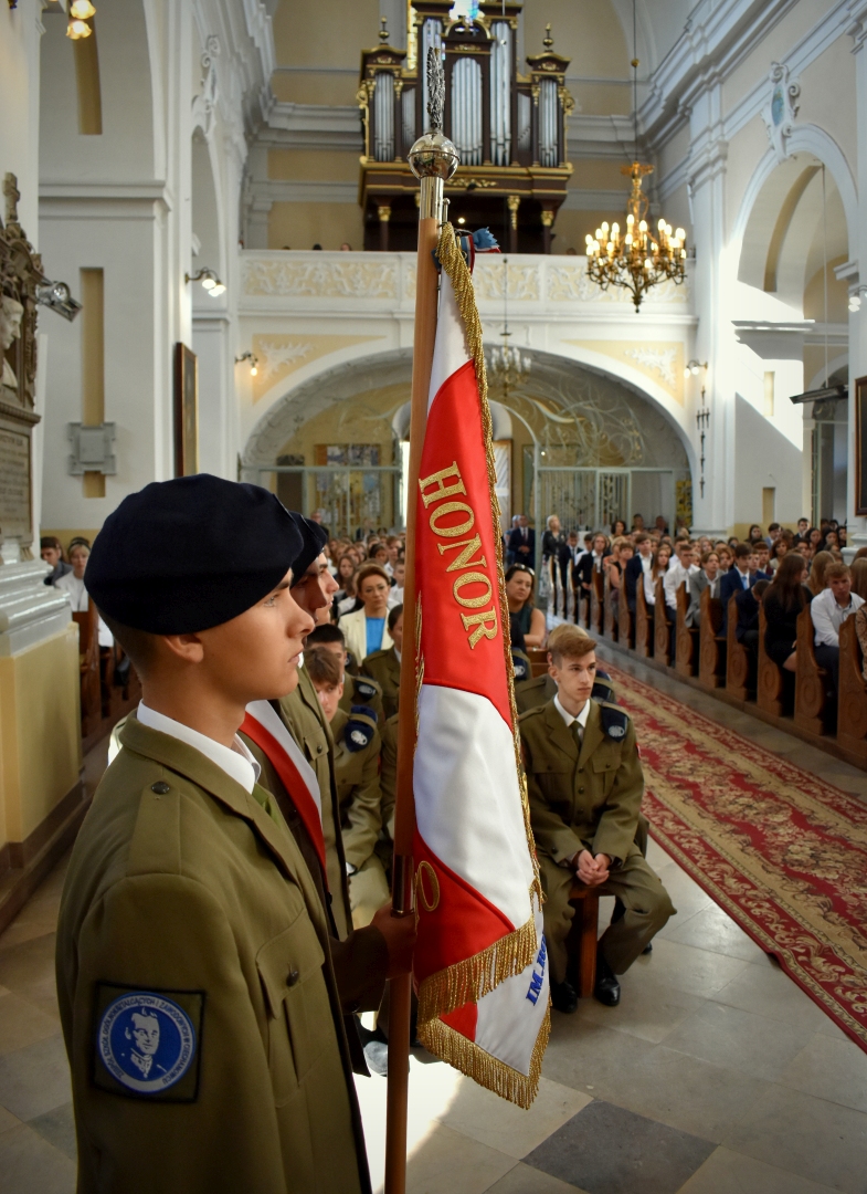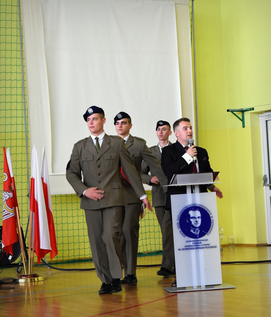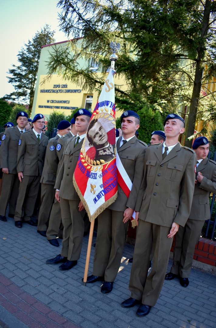 Kolejnym, bardzo istotnym punktem uroczystości było ślubowanie klas pierwszych. Przedstawiciele każdej klasy przysięgając na sztandar w imieniu własnym i kolegów powtarzali tekst ślubowania, zobowiązując się jednocześnie do wytrwałej pracy oraz zachowania godnego ucznia ZSOiZ w Ciechanowcu i obywatela Polski.