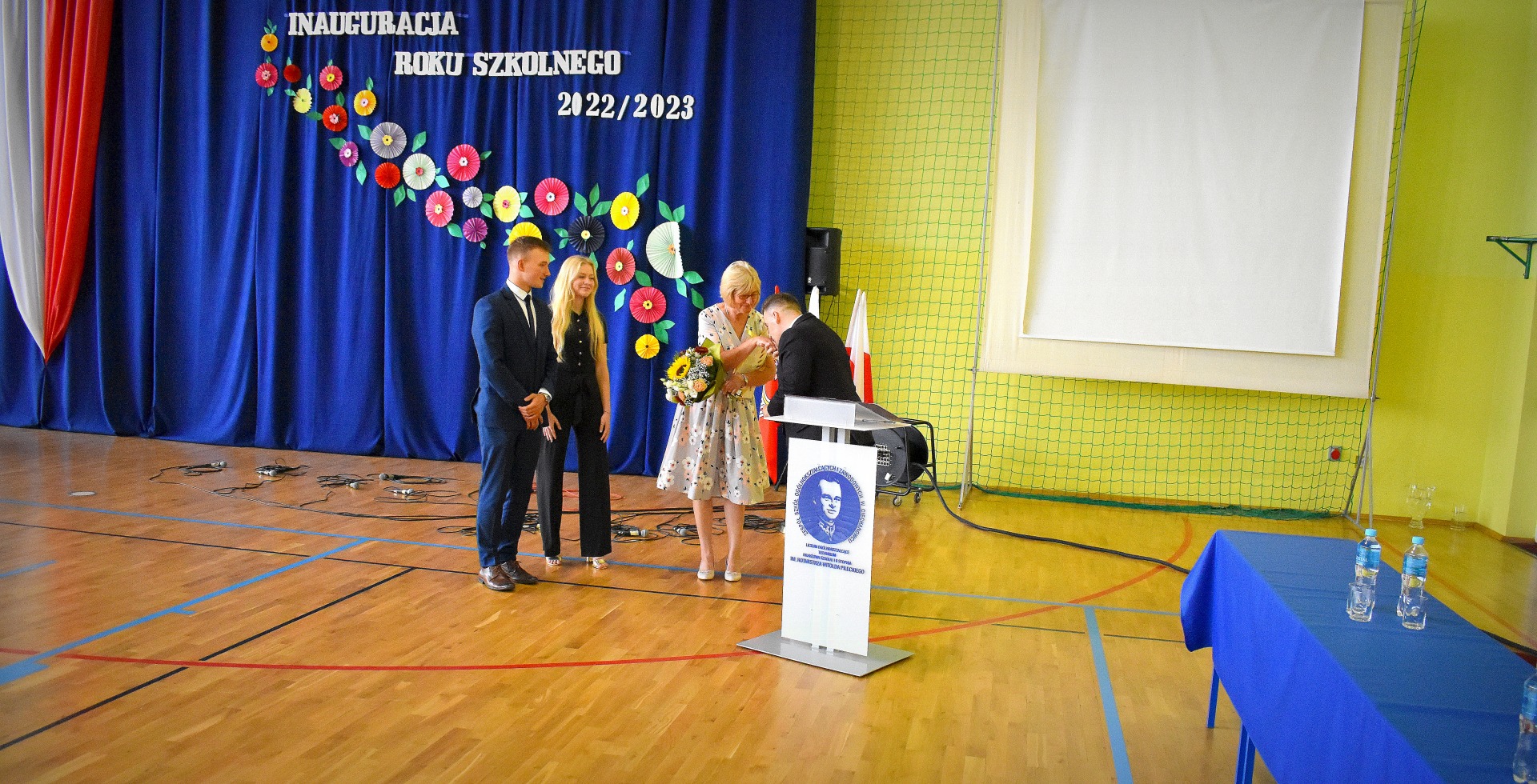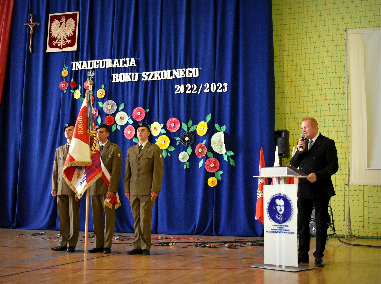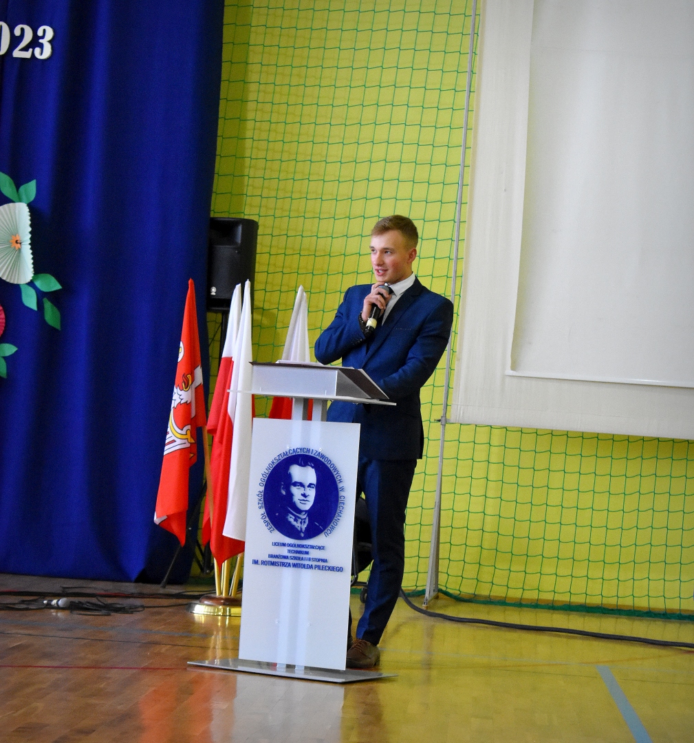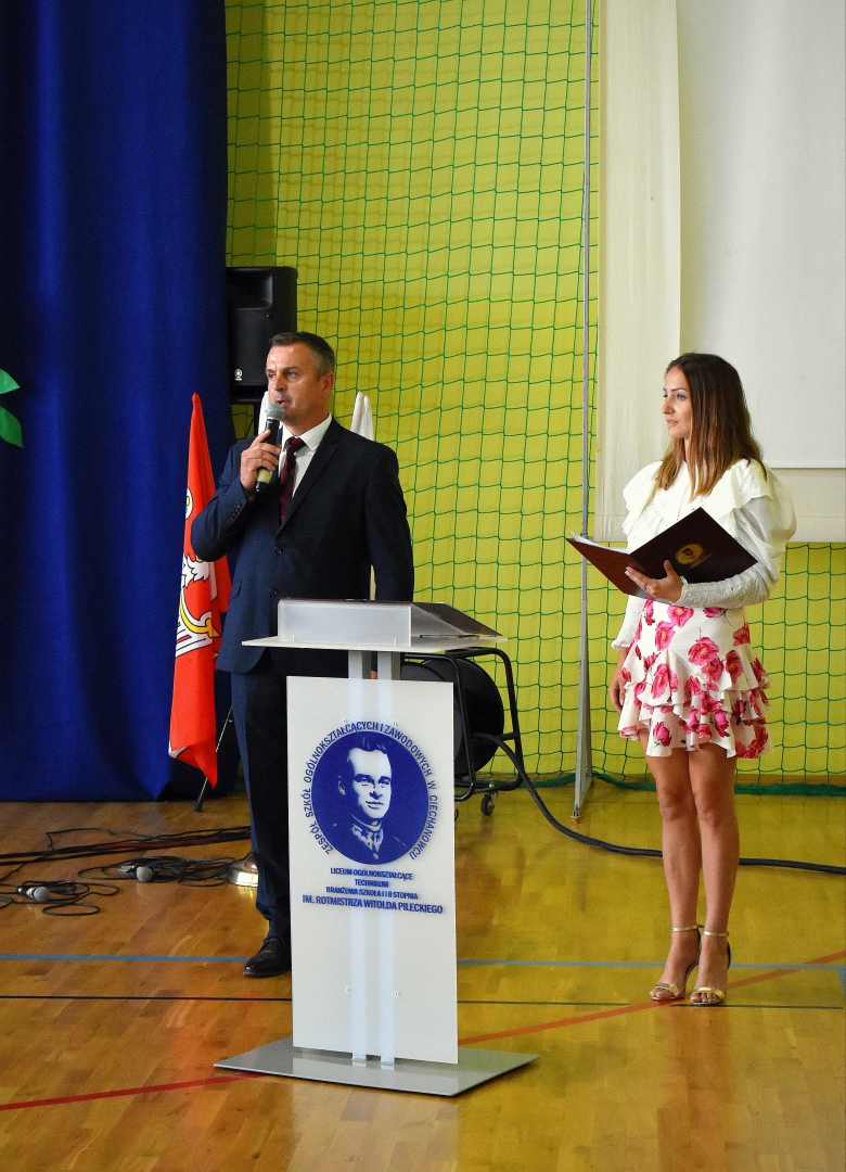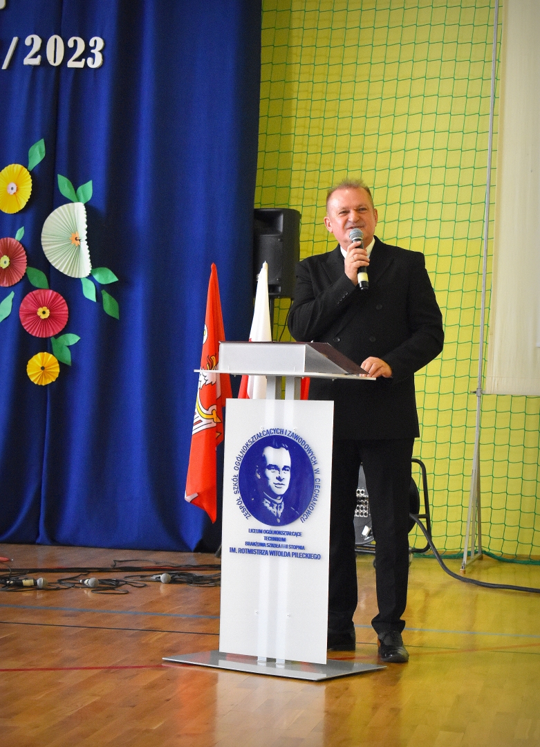 W hali sportowej odbył się apel, który rozpoczął Dyrektor ZSOiZ w Ciechanowcu Pan Łukasz Godlewski. Powitał on gorąco przybyłych gości, nauczycieli, pracowników szkoły, uczniów i rodziców na akademie rozpoczęcia nowego roku szkolnego.
