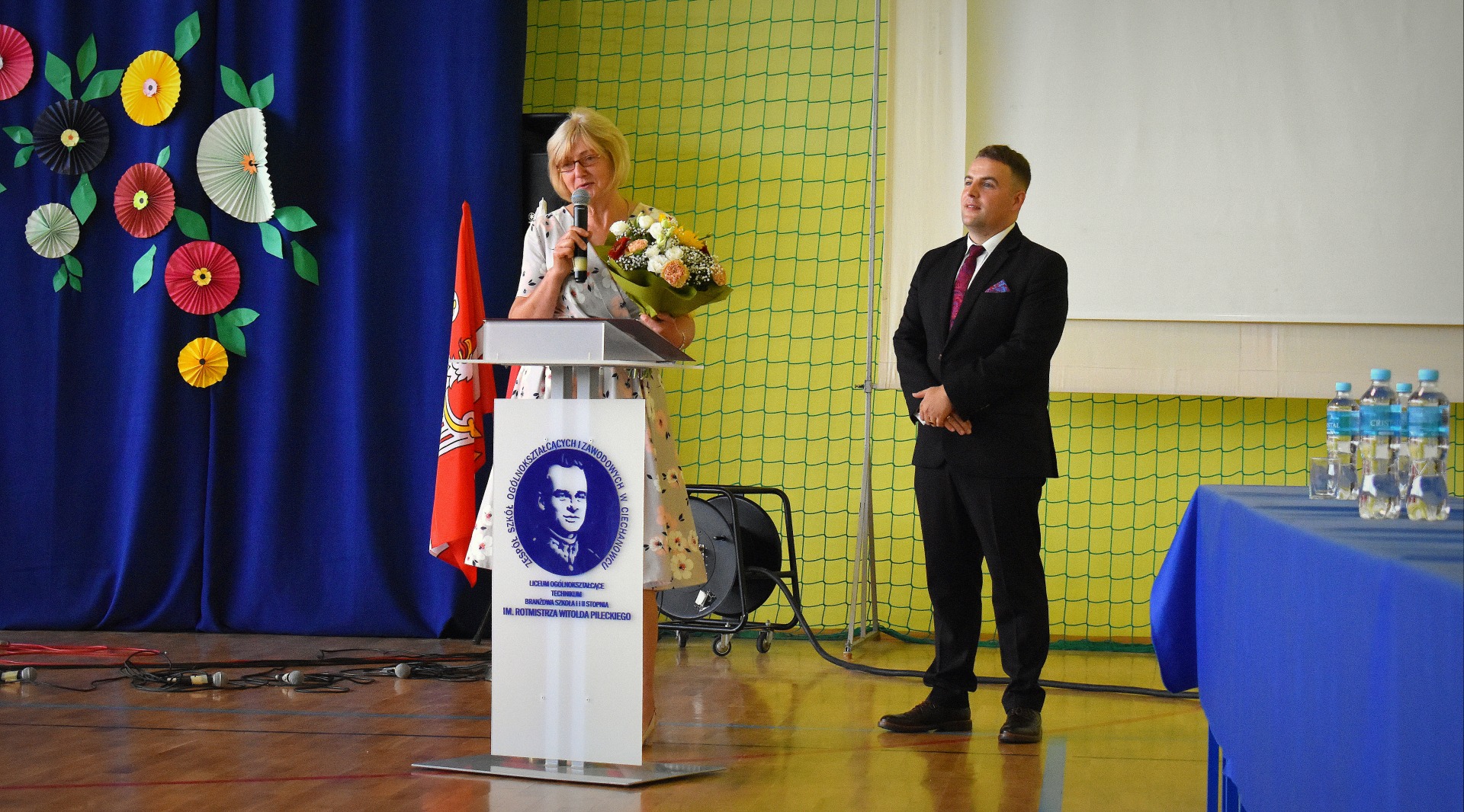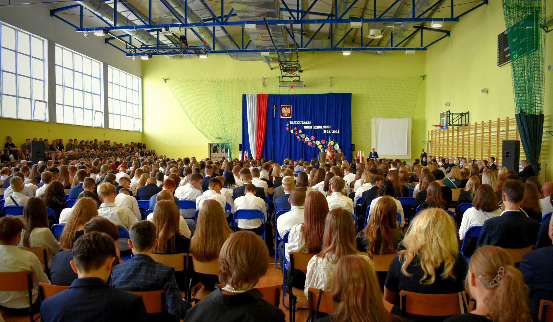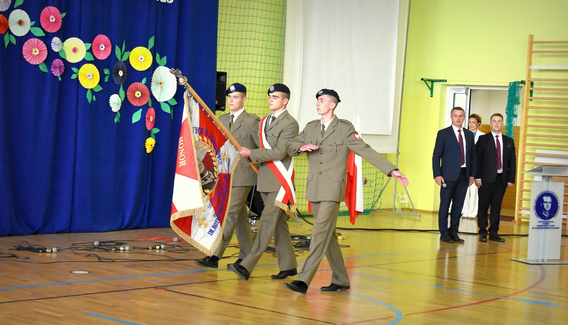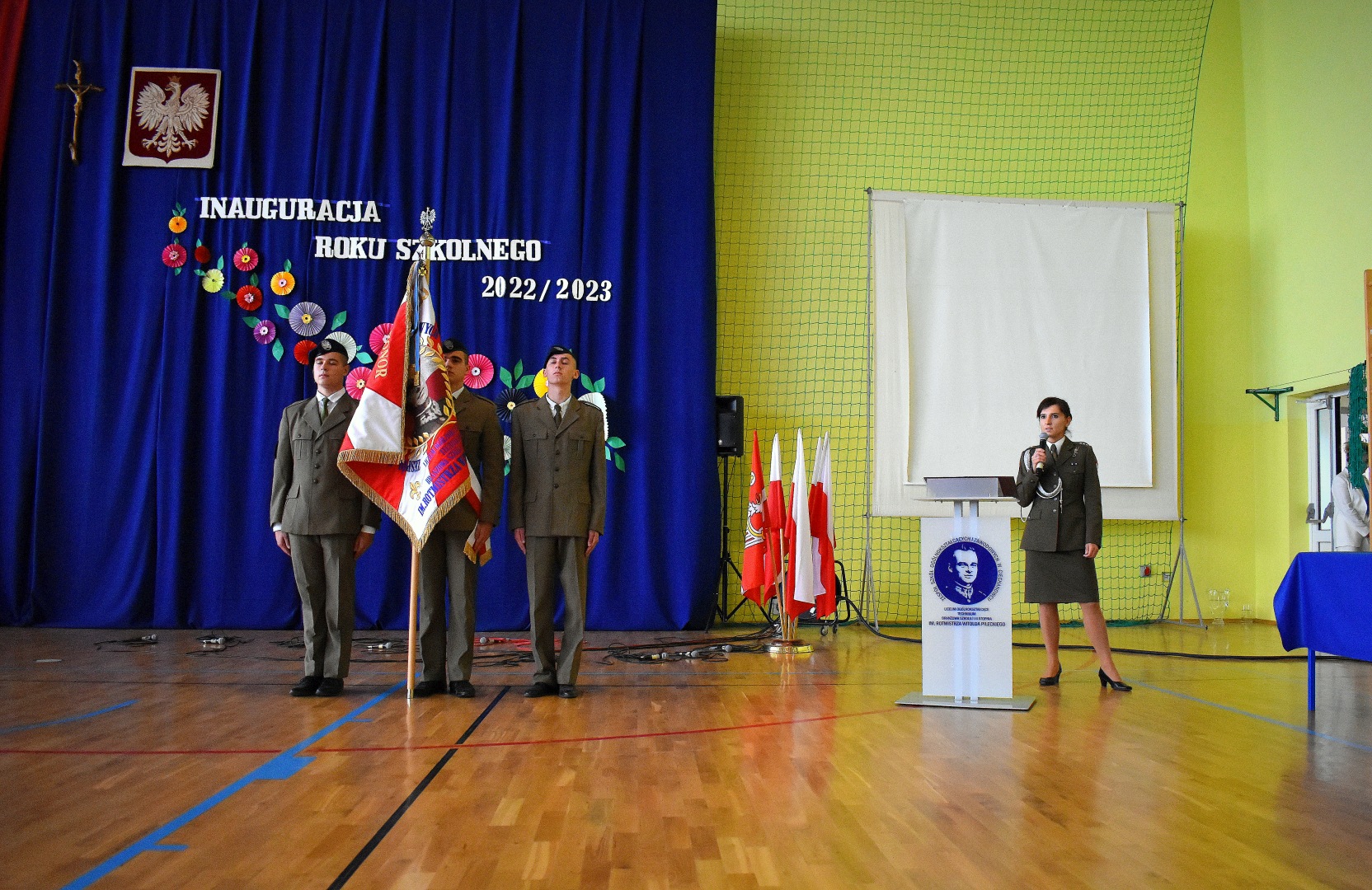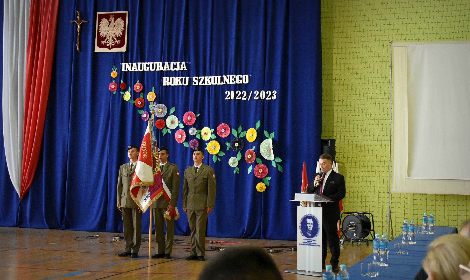 W hali sportowej odbył się apel, który rozpoczął Dyrektor ZSOiZ w Ciechanowcu Pan Łukasz Godlewski. Powitał on gorąco przybyłych gości, nauczycieli, pracowników szkoły, uczniów i rodziców na akademie rozpoczęcia nowego roku szkolnego.